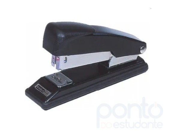 Grampeador com apoio e base plástica, estrutura metálica, tamanho pequeno, utiliza grampo 26/6, 3 tipos de formas para grampear.