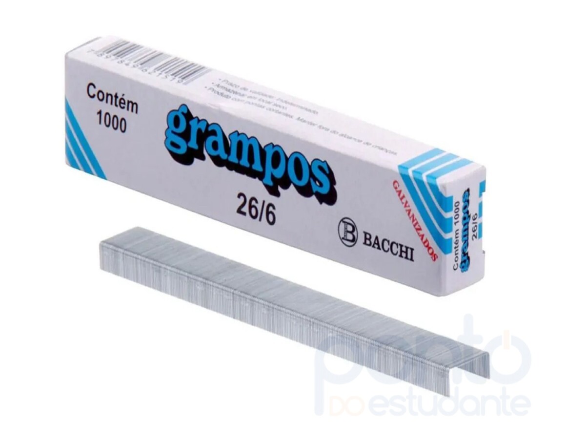 Grampo Bacchi 26/6 galvanizado, perfeito para uso em escritórios ou gráficas, para ser utilizado em grampeadores com perfuração de até 20 folhas.