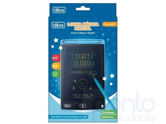 Com design portátil e leve, conta com uma tela LCD sensível à pressão e vem com uma caneta para criação de desenhos e para a prática da escrita de números e letras.