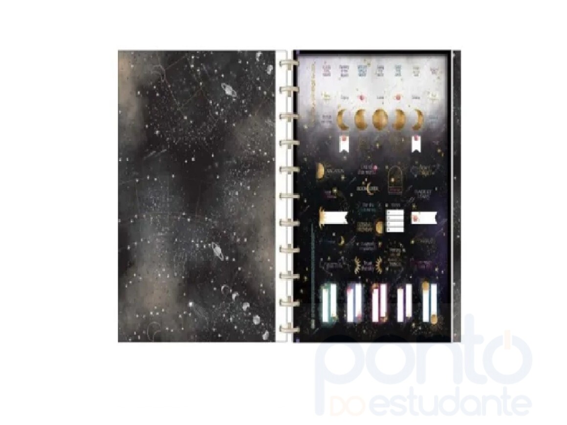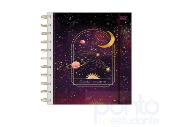 O Caderno Tilidisco Universitário Connect 10 Matérias Magic 160 Folhas é o caderno de discos da Tilibra com visual inspirado nos astros e mistérios cósmicos. O produto é desenvolvido com capa dura removível, 11 discos, bolsa plástica, índice, separador de matérias, adesivos para decorar e 160 folhas de 90 g/m², que podem ser tiradas e adicionadas, quantas vezes quiser, para anotar as aulas, fazer resumos, listar tarefas e organizar as ideias de forma prática e eficiente.