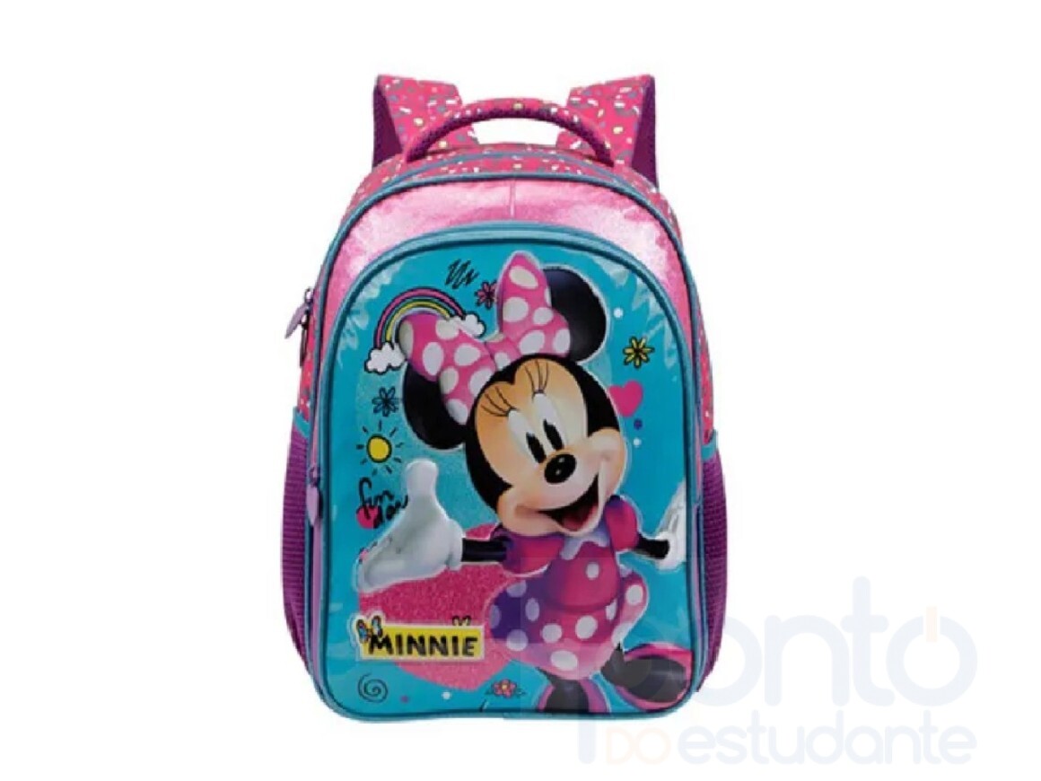 Em tamanho 16", produzida em poliéster resistente e estampado. Painel frontal PVC vincado com espuma com detalhes com glitter - Compartimento principal amplo mais um compartimento frontal , 2 bolsos laterais mesh, zíper com puxadores personalizados, alça de mão em nylon com mesh e piping com glitter . Alças acolchoadas com regulagem de tamanho para maior conforto.