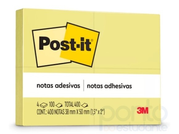 DescriçãoCaracterísricas do ProdutoO clássico das anotações. Lembretes e recados ficam mais especiais e organizados com os blocos adesivos Post-it. Lembretes não precisam ser longos. Aqui, o pequeno notável do mundo da organização ganha notoriedade: os Blocos Adesivos Post-it de 38 mm x 50 mm são ideais para organizar sem ocupar espaço em casa, no trabalho ou na sala de aula. Além de ser reciclável, todo papel utilizado na produção do Post-it é certificado pela renomada instituição internacional SFI (Sustainable Forestry Initiative), garantindo que a matéria prima venha de florestas bem administradas com árvores replantadas.Blocos Adesivos Post-it® Cor: Amarelo 4 Blocos 100 folhas cada total 400 folhas Medidas: 38 mm x 50 mm Ideal para pequenas anotações e lembretes Ocupa pouco espaço Reciclável