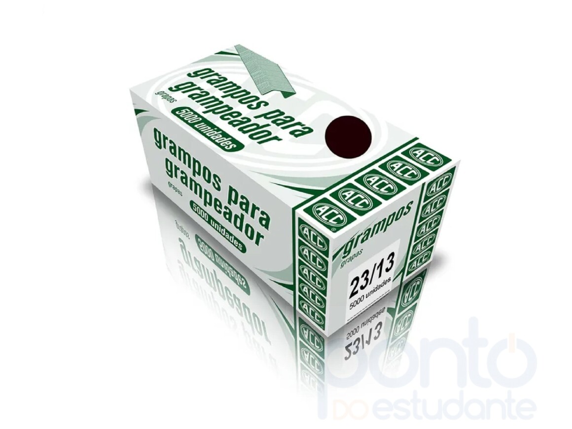 Os grampos da linha 23 sao indicados para escritorios e graficas com capacidade para grampear ate 200 folhas com 75 gm O modelo 2313 grampeia ate 90 folhas de 75 gm ou de acordo com a especificacao do fabricante de cada grampeador verificando sempre o estado de conservacao do mesmo Grampos Acc fabricados com arame de aco e tem tratamento contra oxidacao A ntiFerrugem sem excesso de cola possui pontas divergentes para melhor fixacao Qualidade superior alta durabilidade e sem rebarbas Quantidade 5000 grampos. Dimensões: Largura - 5cm, Altura - 5cm e Comprimento - 12cm. CAIXA