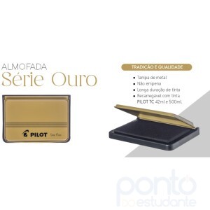 DescriçãoA almofada para carimbo série Ouro, distinta pela sua tampa de metal, uma homenagem às primeiras almofadas da PILOT no Brasil, representa tradição e qualidade. Este produto é resistente, apresentand...